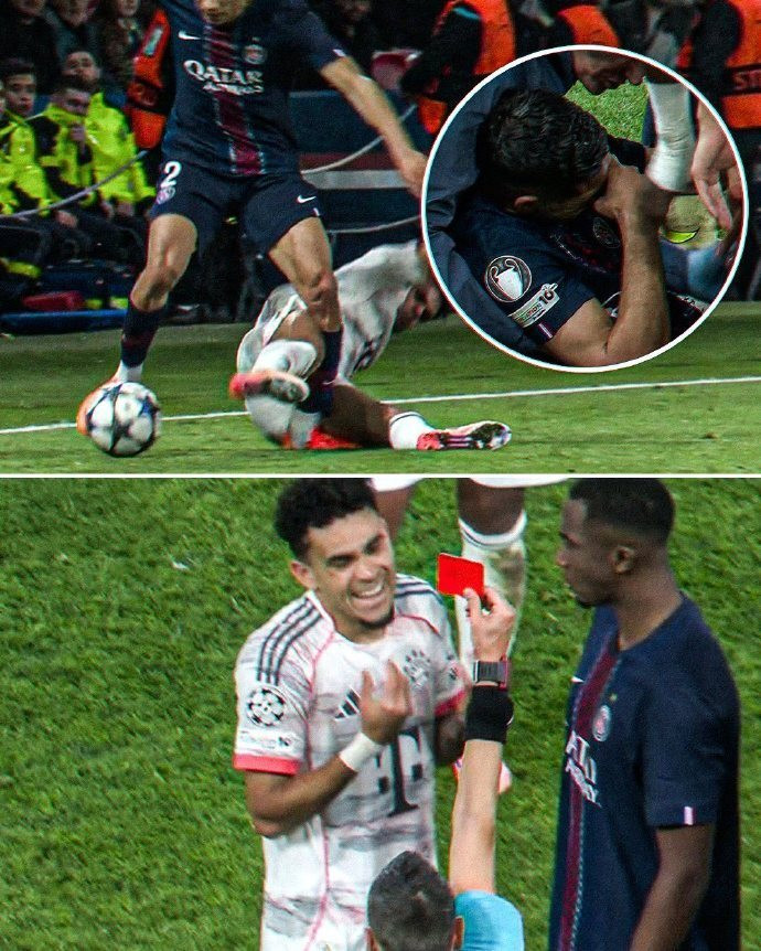 然而或许是情绪过于亢奋,半场补时第3分钟,杀得兴起的迪亚斯却在一次拼抢中,直接从背后飞铲大巴黎的王牌边后卫阿什拉夫。